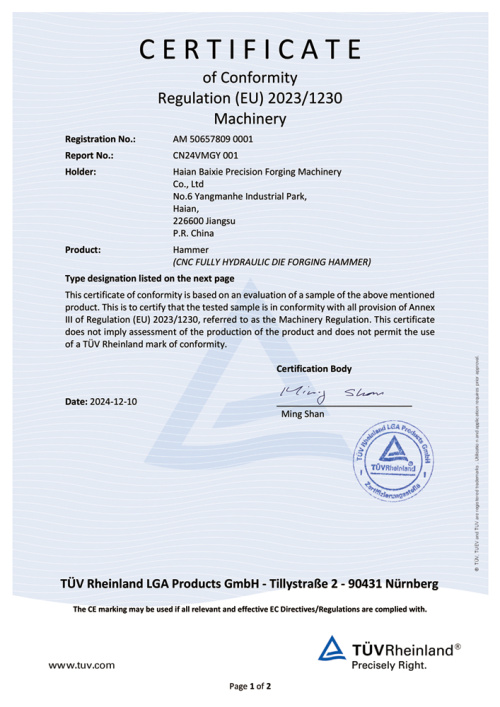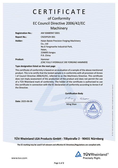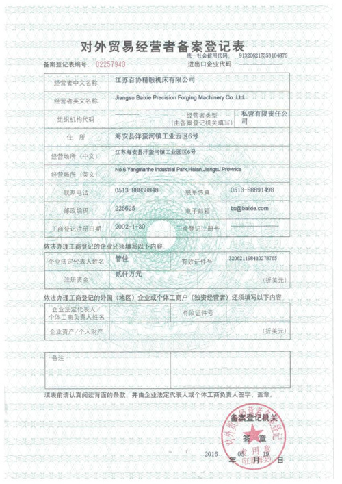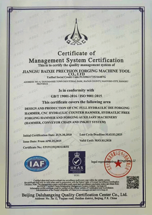 Jiangsu Baixie प्रिसिजन फोर्जिंग मशीन टूल कं, लिमिटेड (पूर्व Hai'an Baixie Forging Hammer Co., Ltd.) चीन में विटालिटी के साथ यांग्त्जे रिवर डेल्टा के उत्तर विंग में जियांग्सु हैआन आर्थिक विकास क्षेत्र में स्थित है, और पूर्व में चीन में शेना एक्सप्रेसवे के हेआआन निकास में स्थित है। यह एक सीएनसी डाई फोर्जिंग हैमर एंटरप्राइज है जो वैज्ञानिक अनुसंधान, उत्पादन और बिक्री को एकीकृत करता है।